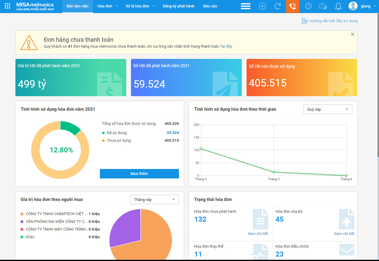 Với phần mềm hóa đơn điện tử MISA meInvoice, nhà quản lý doanh nghiệp dễ dàng nắm được tình hình sử dụng hóa đơn thông qua các báo cáo, biểu đồ trực quan