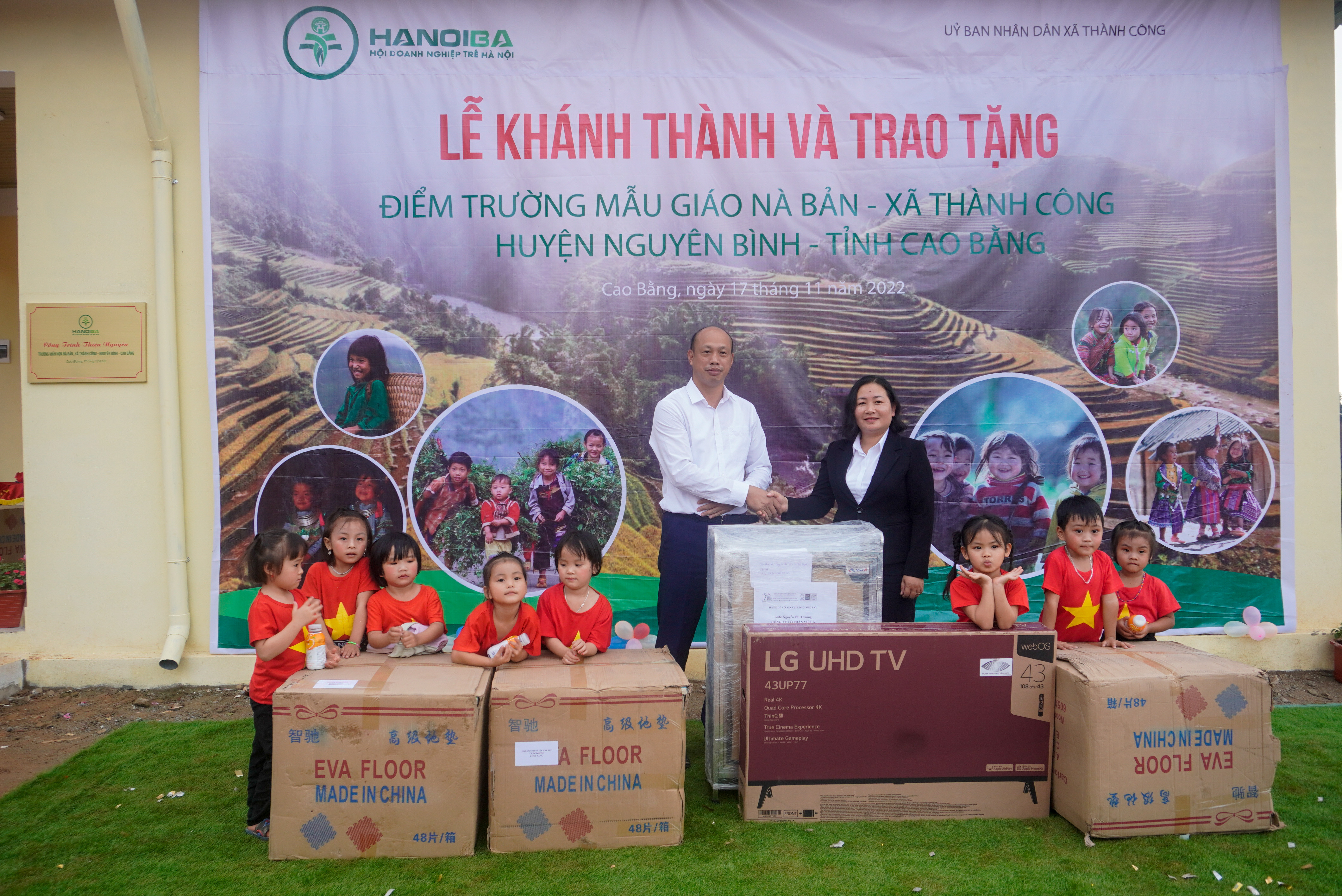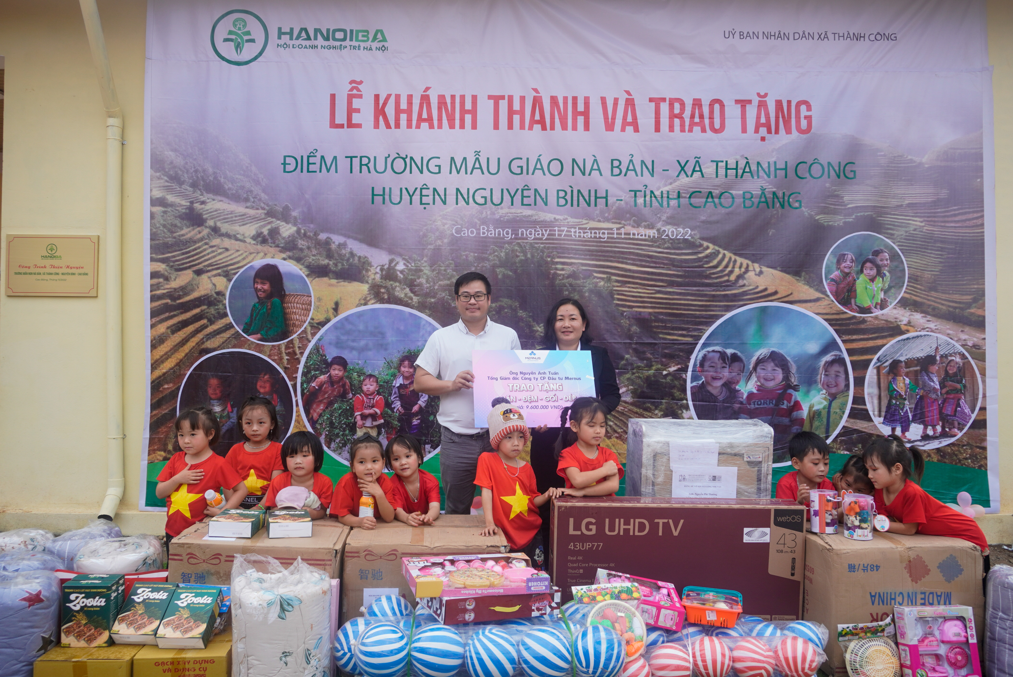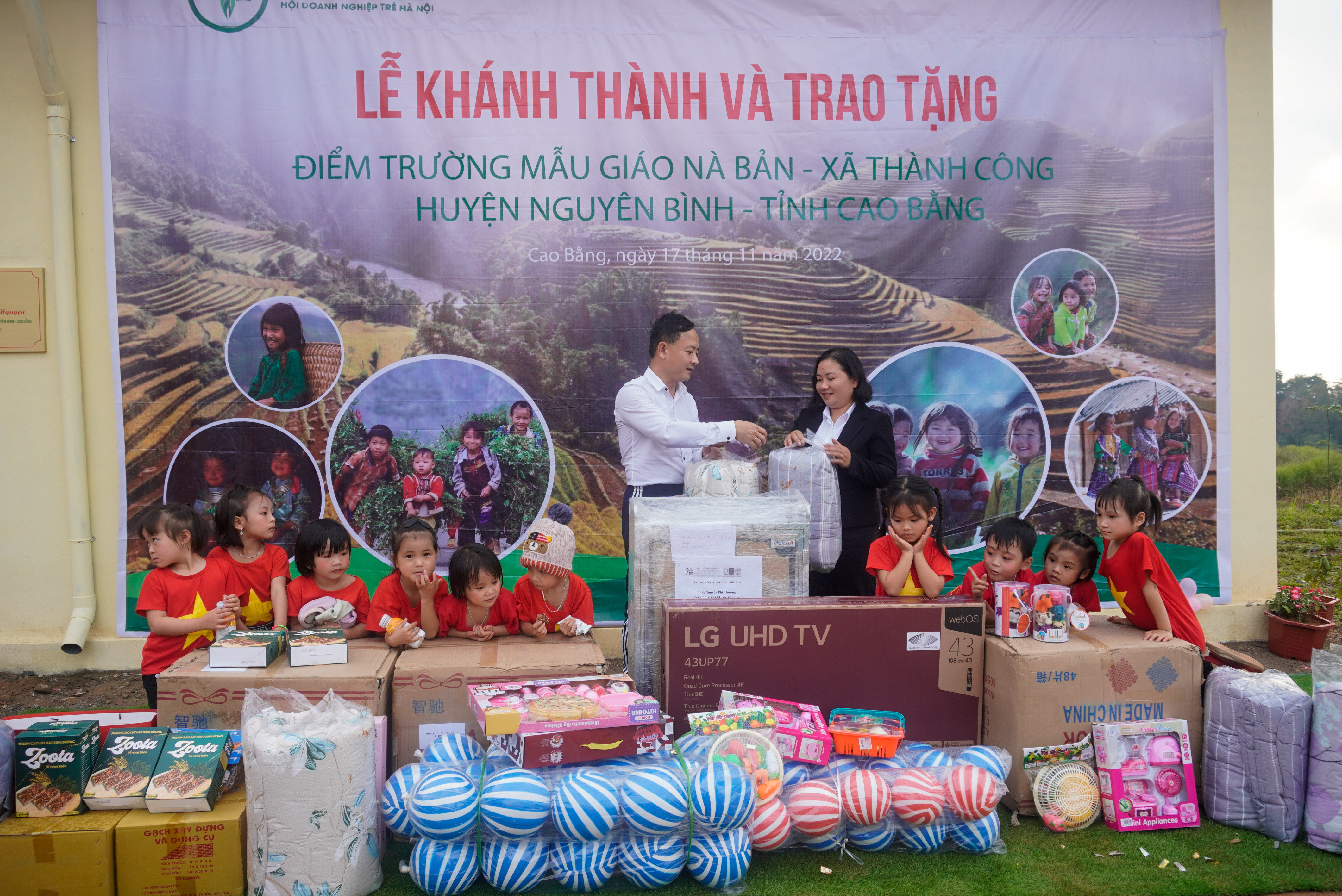 Thay mặt Ban Lãnh đạo Hội Doanh nghiệp trẻ Hà Nội xin được gửi lời cảm ơn chân thành đến sự chung tay của các Doanh Nghiệp Hội viên Hội Doanh nghiệp trẻ Hà Nội đã góp phần hoàn thiện điểm trường mầm non Nà Bản, xã Thành Công, huyện Nguyên Bình, tỉnh Cao Bằng. Vậy là trong năm học mới, các con đã có được một mái trường sạch đẹp, một lớp học kiên cố, chăn ấm, đệm êm, nhiều đồ chơi hơn, nhiều sách hơn. Hi vọng với những món quà này, các con sẽ thuận tiện hơn trong việc học tập và vui chơi.
