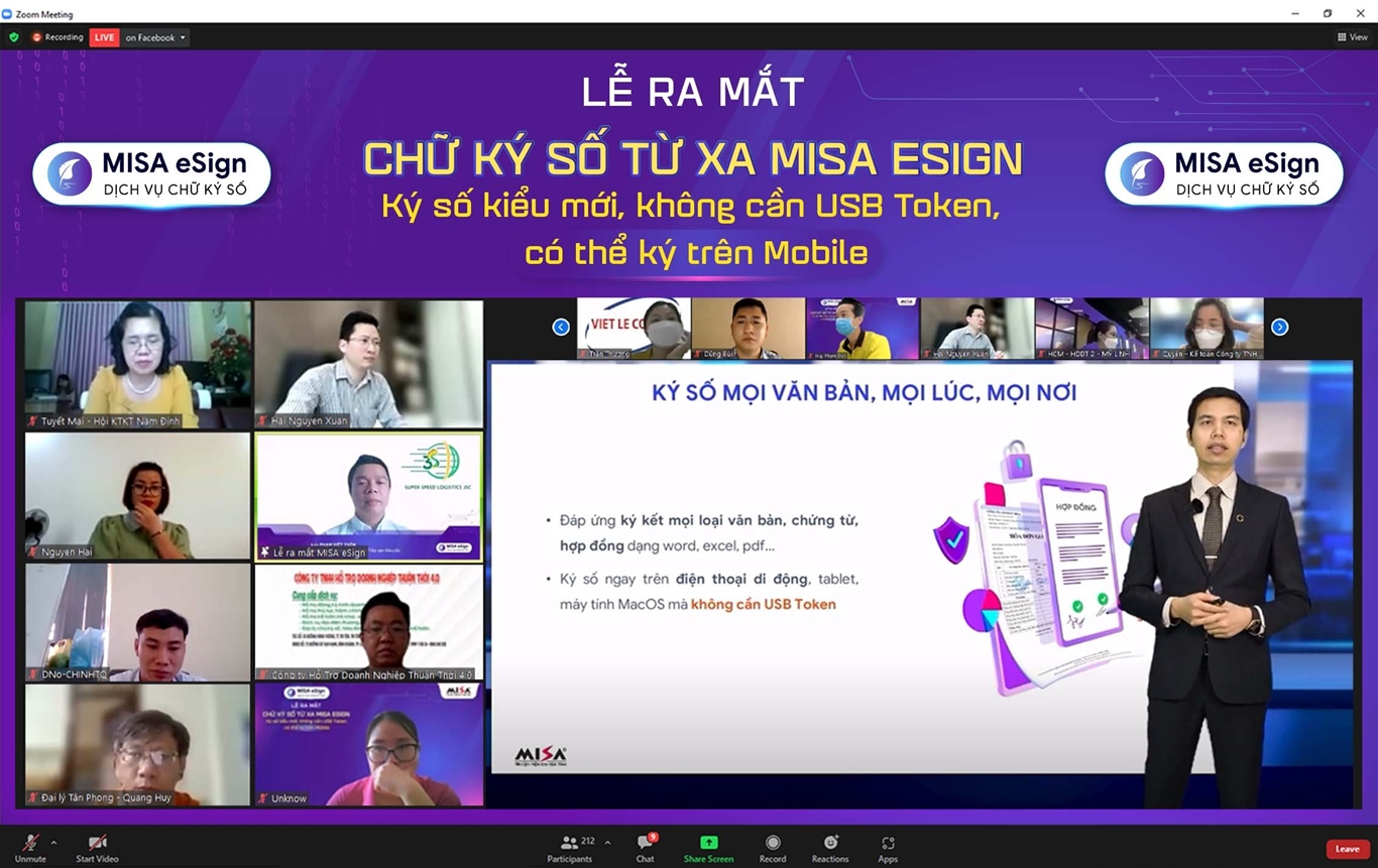Vào ngày 06/04/2022, Công ty Cổ phần MISA tổ chức lễ ra mắt chính thức sản phẩm chữ ký số từ xa MISA eSign. Thu hút đông đảo sự quan tâm của công chúng, buổi lễ được tổ chức dưới hình thức trực tuyến qua Zoom đồng thời livestream trên Fanpage Công ty Cổ phầm MISA. Tại buổi lễ, ông Lê Hồng Quang, Phó Tổng giám đốc thường trực MISA nhấn mạnh rằng “Trong quá trình triển khai dịch vụ chữ ký số từ xa, bên cạnh tính pháp lý, MISA đặc biệt chú trọng đến tính tiện ích và trải nghiệm người dùng. MISA eSign ra đời xuất phát những nỗ lực của Công ty Cổ phần MISA trong việc thúc đẩy các hoạt động của nền kinh tế số, góp phần mạnh mẽ vào quá trình chuyển đổi số quốc gia”.