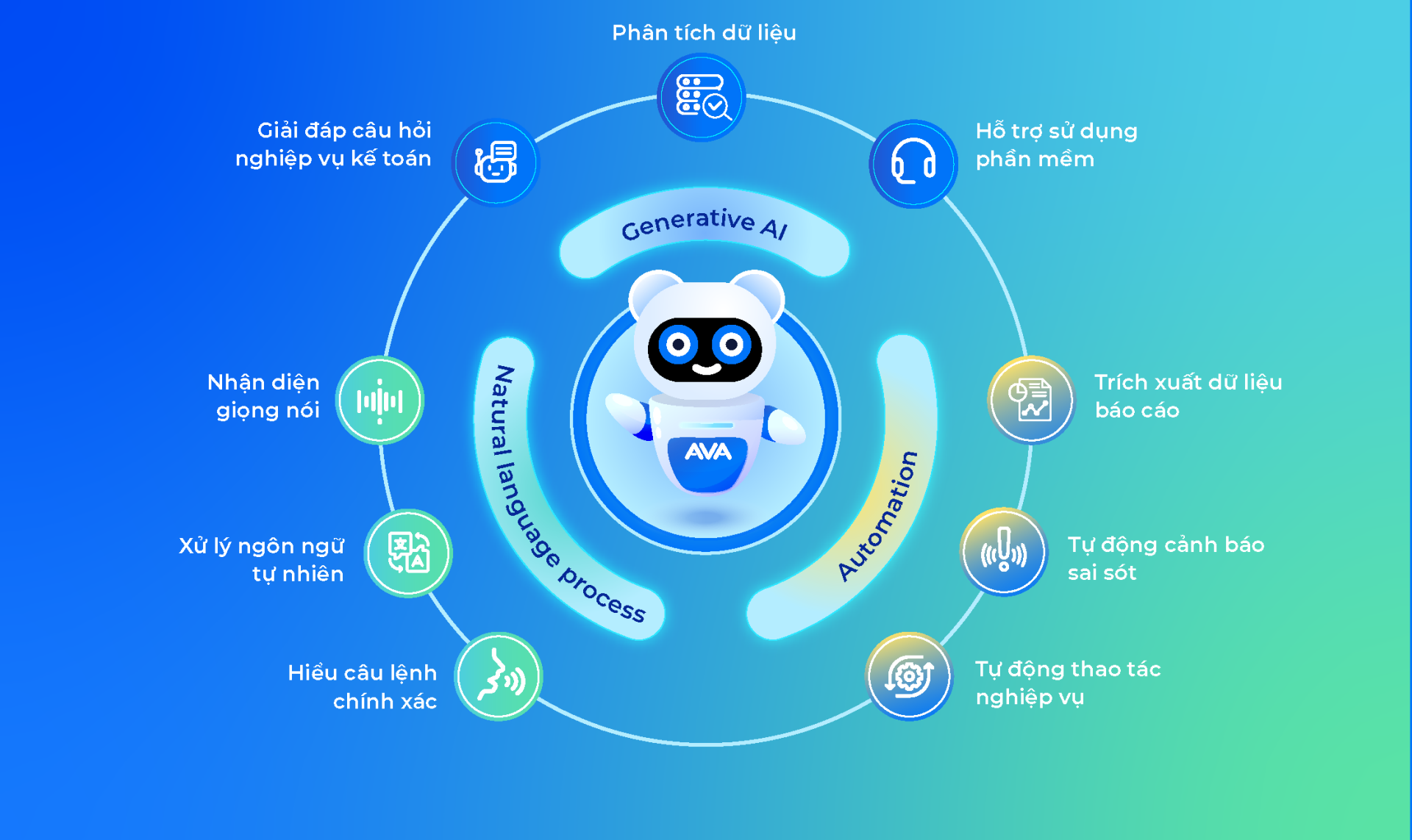 Trợ lý trí tuệ nhân tạo MISA AVA được tích hợp vào nền tảng MISA AMIS với các công nghệ hiện đại nhất hiện nay như Generative AI, Automation, Natural language process.