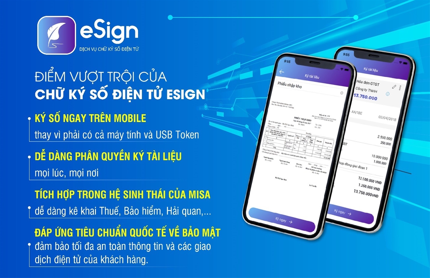 Công ty Cổ phần MISA đã chính thức phát hành eSign – Dịch Chữ ký số điện tử không dùng USB Token. Đây là xu hướng mới của các doanh nghiệp hiện nay để đơn giản hóa thao tác ký số, phát hành hóa đơn điện tử linh hoạt, mọi lúc mọi nơi ngay trên smart phone.