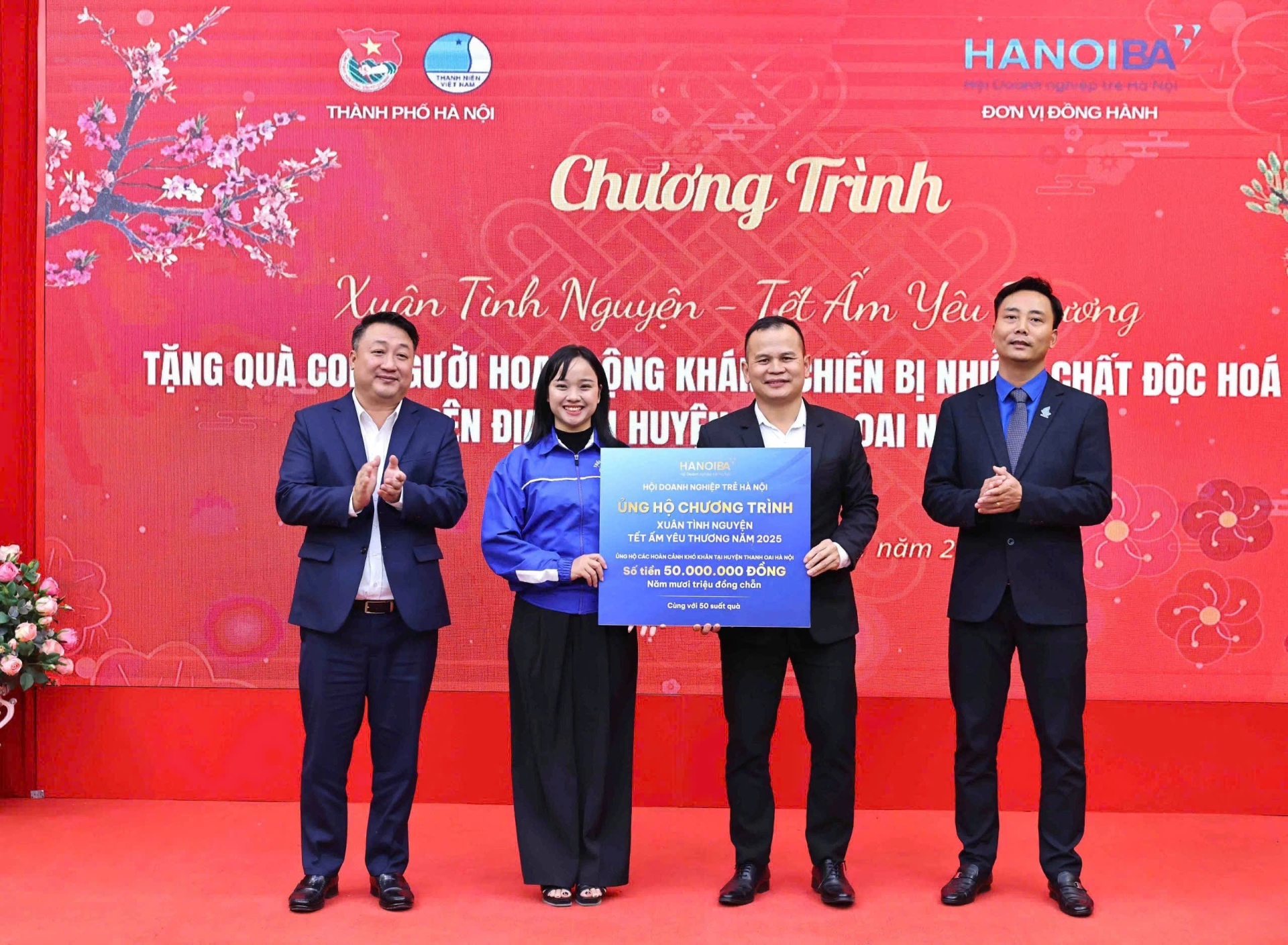 Trước đó, ngày 17/01, trong khuôn khổ Hội nghị "Tổng kết công tác Hội và phong trào thanh niên năm 2024; triển khai nhiệm vụ năm 2025", Phó Chủ tịch kiêm Tổng thư ký HANOIBA - Anh Trần Văn Minh đã đại diện Hội DNT Hà Nội đã trao biển tặng quà chương trình “Xuân tình nguyện, Tết ấm yêu thương” gồm 50.000.000đ tiền mặt và quà tặng.